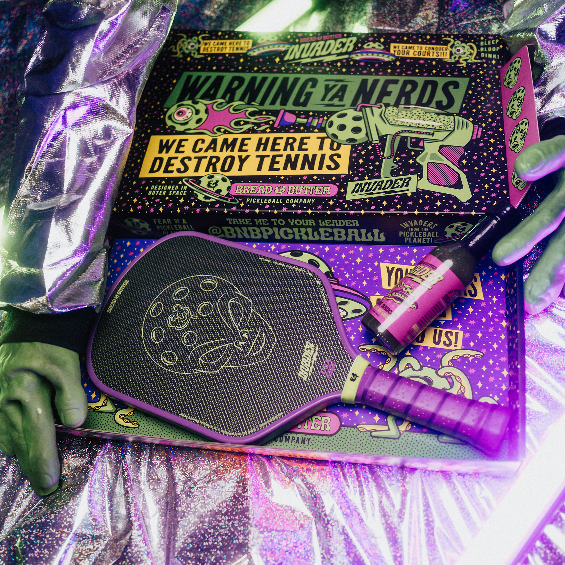 The Invader is a Hybrid paddle with a layer of Fiber Glass creating a poppy little rocket ship with fantastic ball feel. The face is made of Electroplated Polyethylene terephthalate substrate with an aluminum deposition interwoven with continuous filaments of carbon atoms arranged into 700 tow increments (T-700 CF x Electroplated Polyester Weave) We're here to conquer your courts. #convertthemall
